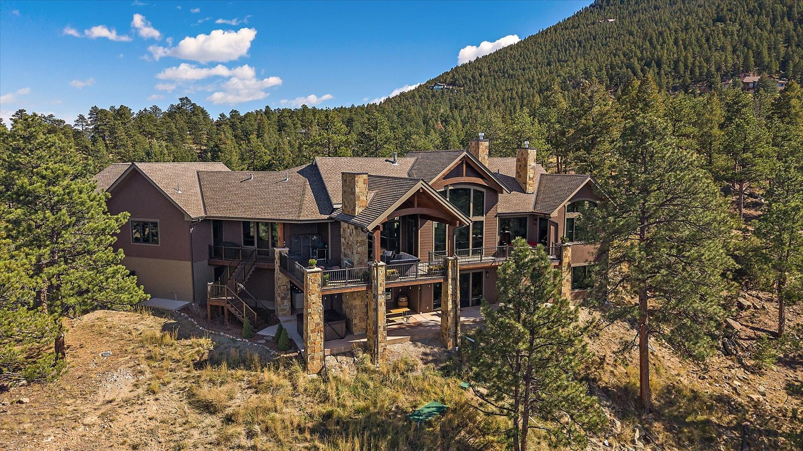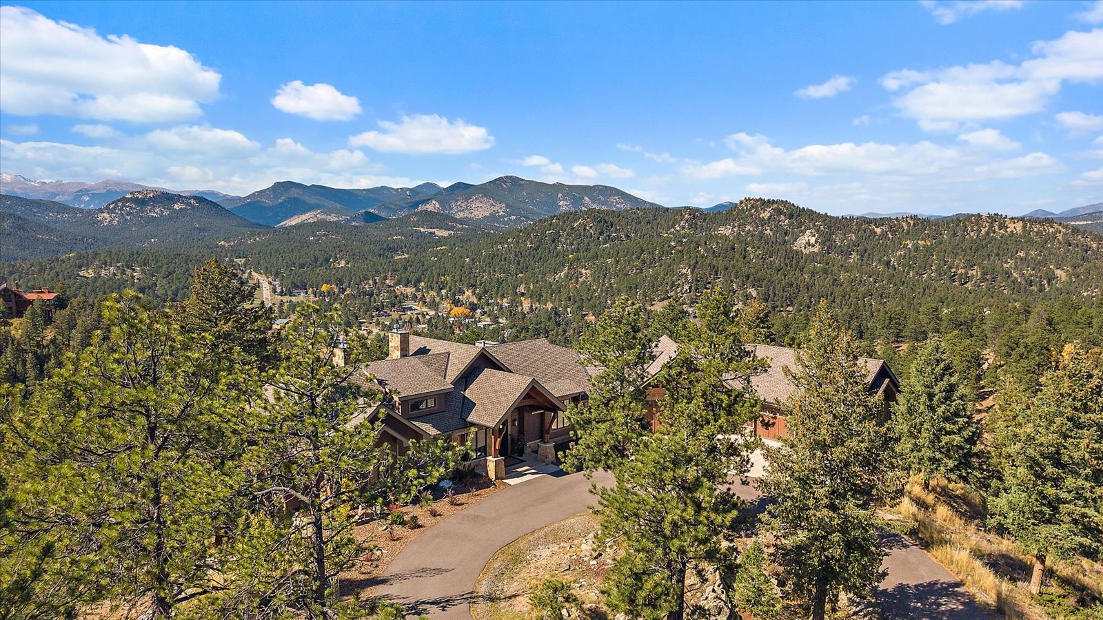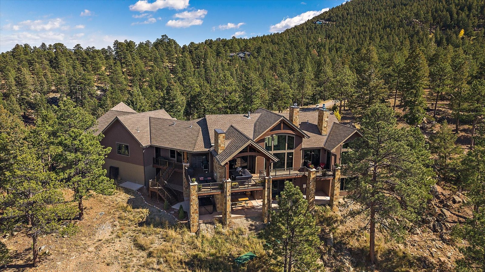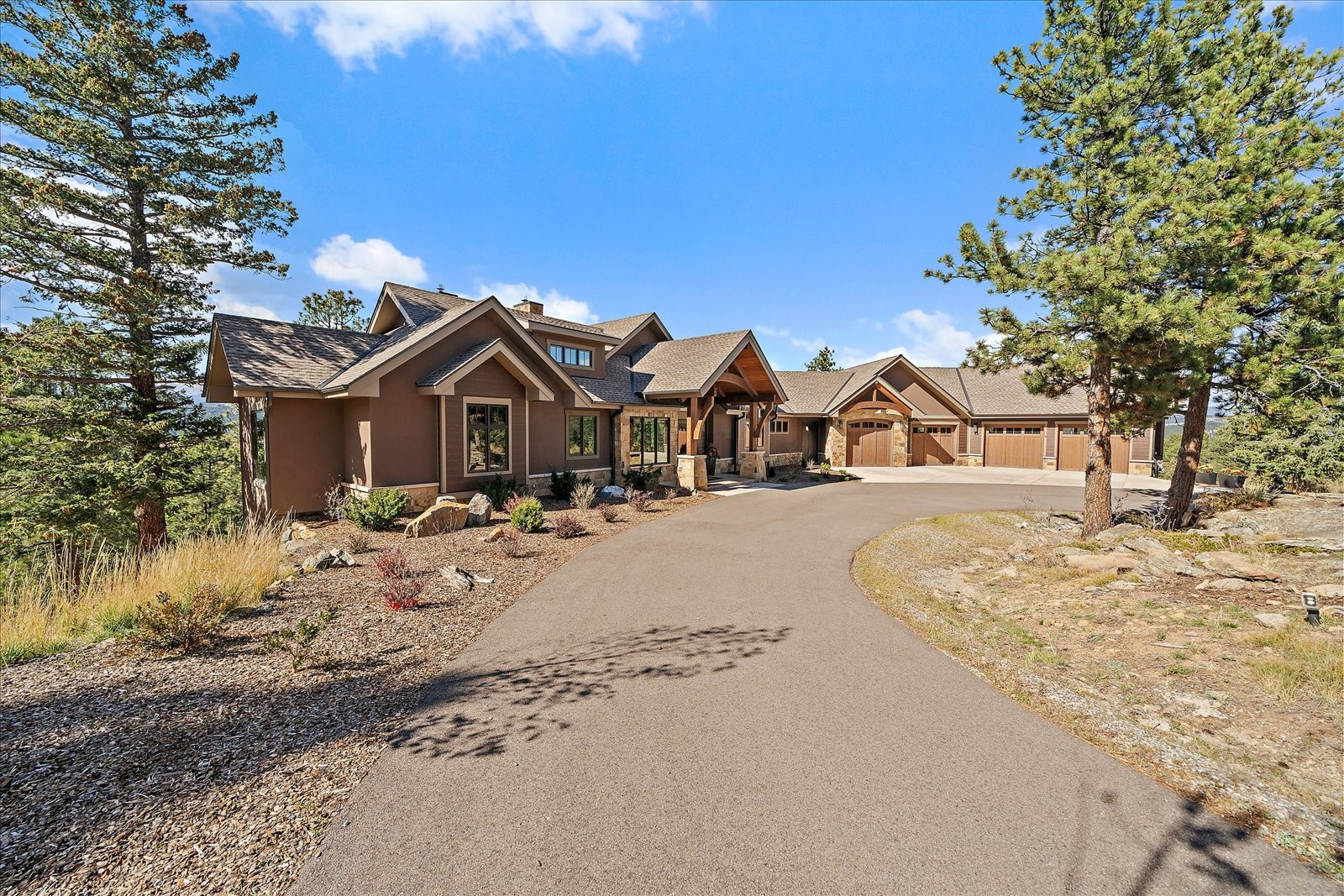 This is the ultimate estate with a blend of convenience, privacy & perhaps the best snow-capped views in Evergreen. This custom home offers luxurious, yet comfortable, mountain living with stunning architectural touches. There is a harmonious blend of rustic and modern finishes. As you enter the foyer, Mt. Blue Sky is optimally framed in the windows beyond. The great room offers a large entertaining area with a warm wood-paneled ceiling & over-sized fireplace. This area flows seamlessly into the dining area that has been designed for gatherings large or small & open to the gourmet kitchen w/ the epicurean in mind. From the gas range to enormous pantry and island, you will love cooking and engaging with family. Thoughtfully constructed with aging in place in mind, the home offers true main level living. A sumptuous primary suite captures the expansive views and a fireplace while the bath is magazine-worthy. Enjoy the huge closet that conveniently connects to the stunning laundry room. The main level office might be difficult to work in given the snow-capped vistas, but it is worth a try. The lower level is the ideal space for entertainment. A game room/family room welcomes you where the pub-like bar will become the hub of the space island & brick surround. A media room makes the perfect space for movie watching & there are two generously-sized bedroom (one has its own en-suite bath). The home gym means less trips leaving your private oasis. A huge bonus is the 2300 sqft unfinished space w/separate garage door. This is a blank slate for your storage, living expansion, hobbies. The attached 3 car garage is heated, and offers a shower and entrance into a mud room that was designed with 4-legged friends in mind. As astonishing as the interior is, the exterior is awesome w/ upper level deck offering an outdoor living room w/ gas fireplace, TV space and multiple seating areas. The lower patio has a private hot tub. Enjoy a real yard, & gentle driveway.