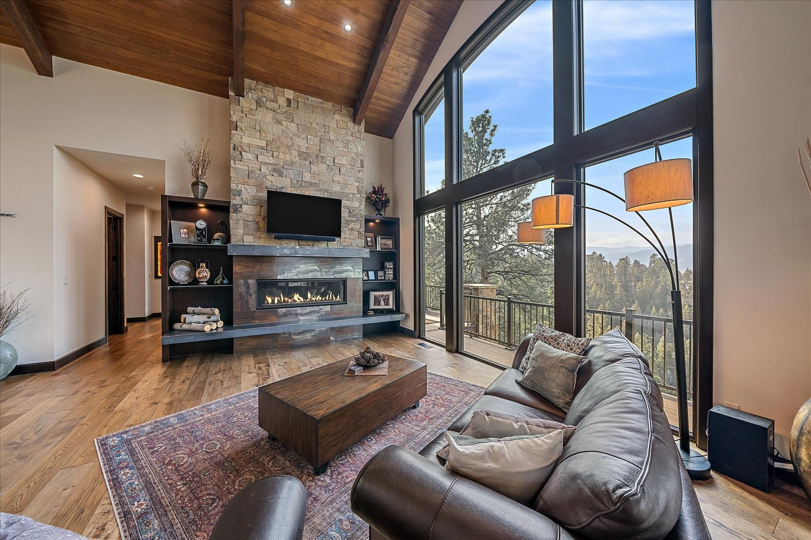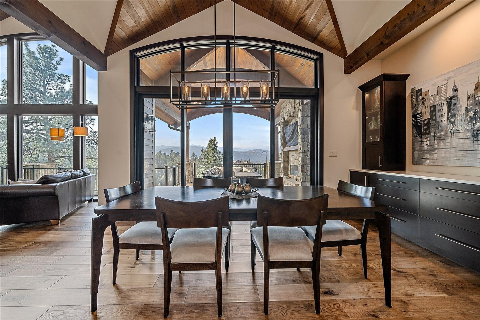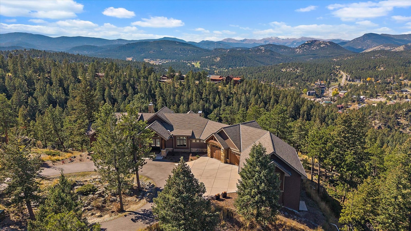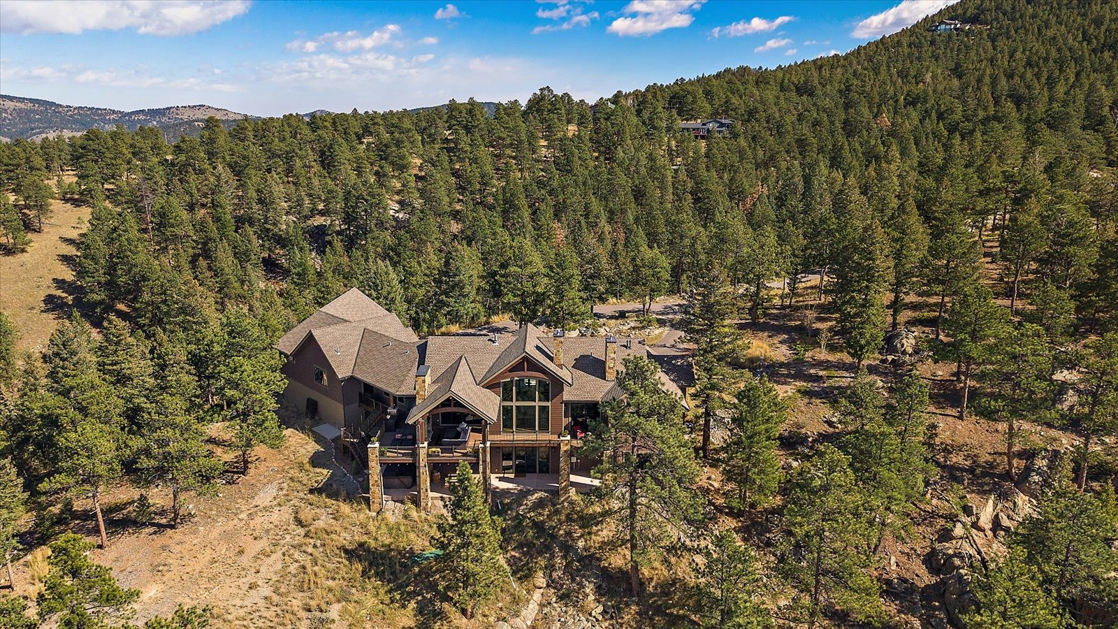 This is the ultimate estate with a blend of convenience, privacy & perhaps the best snow-capped views in Evergreen. This custom home offers luxurious, yet comfortable, mountain living with stunning architectural touches. There is a harmonious blend of rustic and modern finishes. As you enter the foyer, Mt. Blue Sky is optimally framed in the windows beyond. The great room offers a large entertaining area with a warm wood-paneled ceiling & over-sized fireplace. This area flows seamlessly into the dining area that has been designed for gatherings large or small & open to the gourmet kitchen w/ the epicurean in mind. From the gas range to enormous pantry and island, you will love cooking and engaging with family. Thoughtfully constructed with aging in place in mind, the home offers true main level living. A sumptuous primary suite captures the expansive views and a fireplace while the bath is magazine-worthy. Enjoy the huge closet that conveniently connects to the stunning laundry room. The main level office might be difficult to work in given the snow-capped vistas, but it is worth a try. The lower level is the ideal space for entertainment. A game room/family room welcomes you where the pub-like bar will become the hub of the space island & brick surround. A media room makes the perfect space for movie watching & there are two generously-sized bedroom (one has its own en-suite bath). The home gym means less trips leaving your private oasis. A huge bonus is the 2300 sqft unfinished space w/separate garage door. This is a blank slate for your storage, living expansion, hobbies. The attached 3 car garage is heated, and offers a shower and entrance into a mud room that was designed with 4-legged friends in mind. As astonishing as the interior is, the exterior is awesome w/ upper level deck offering an outdoor living room w/ gas fireplace, TV space and multiple seating areas. The lower patio has a private hot tub. Enjoy a real yard, & gentle driveway.