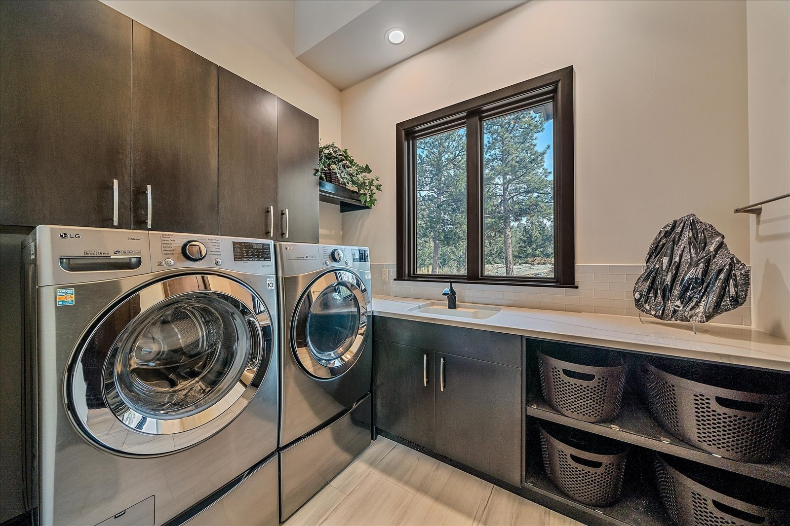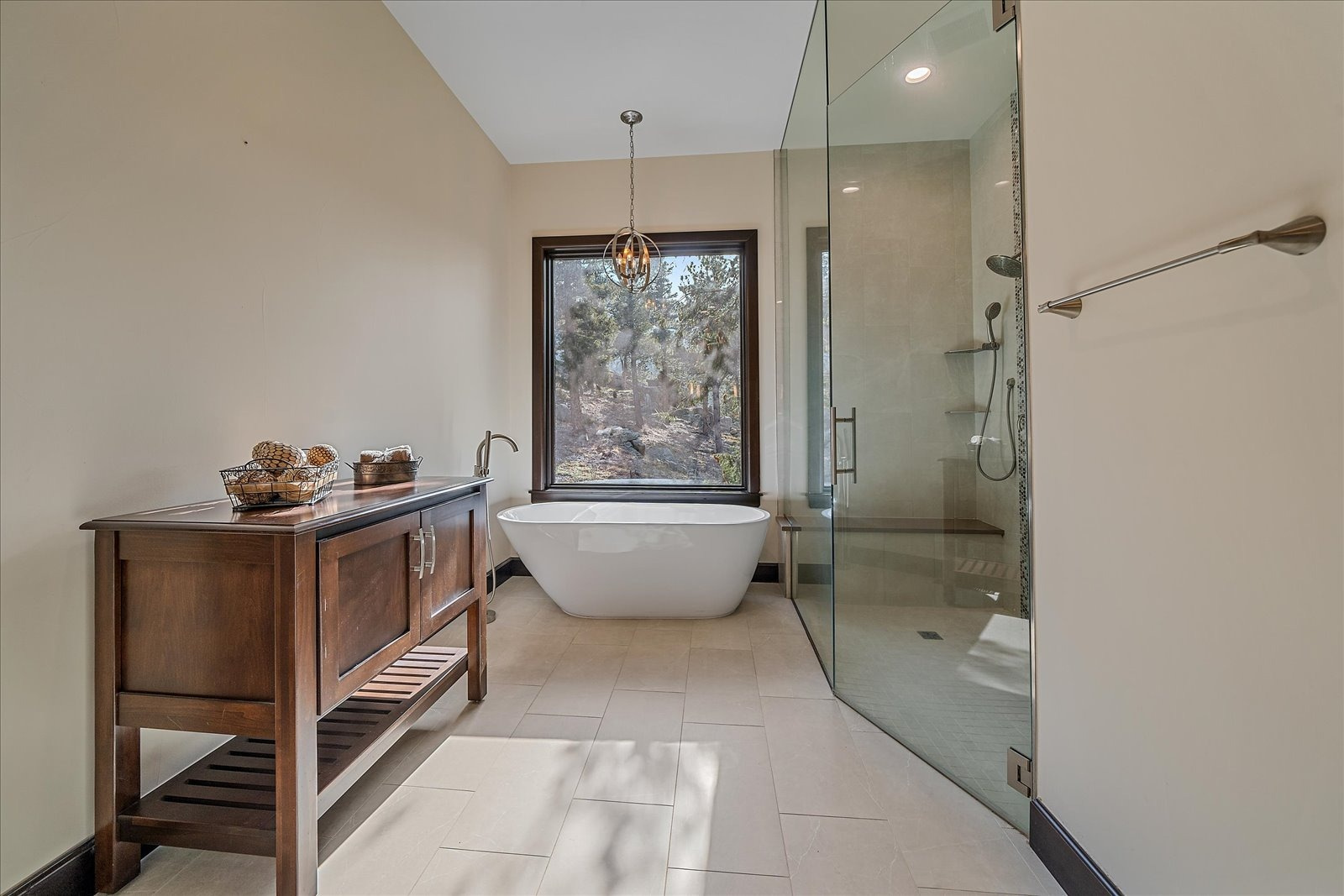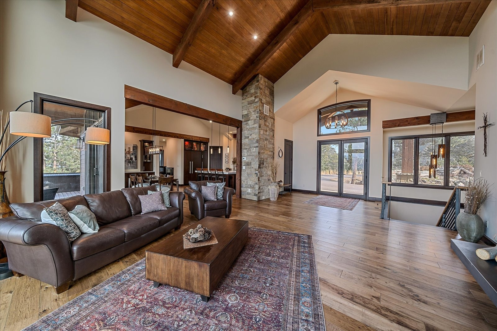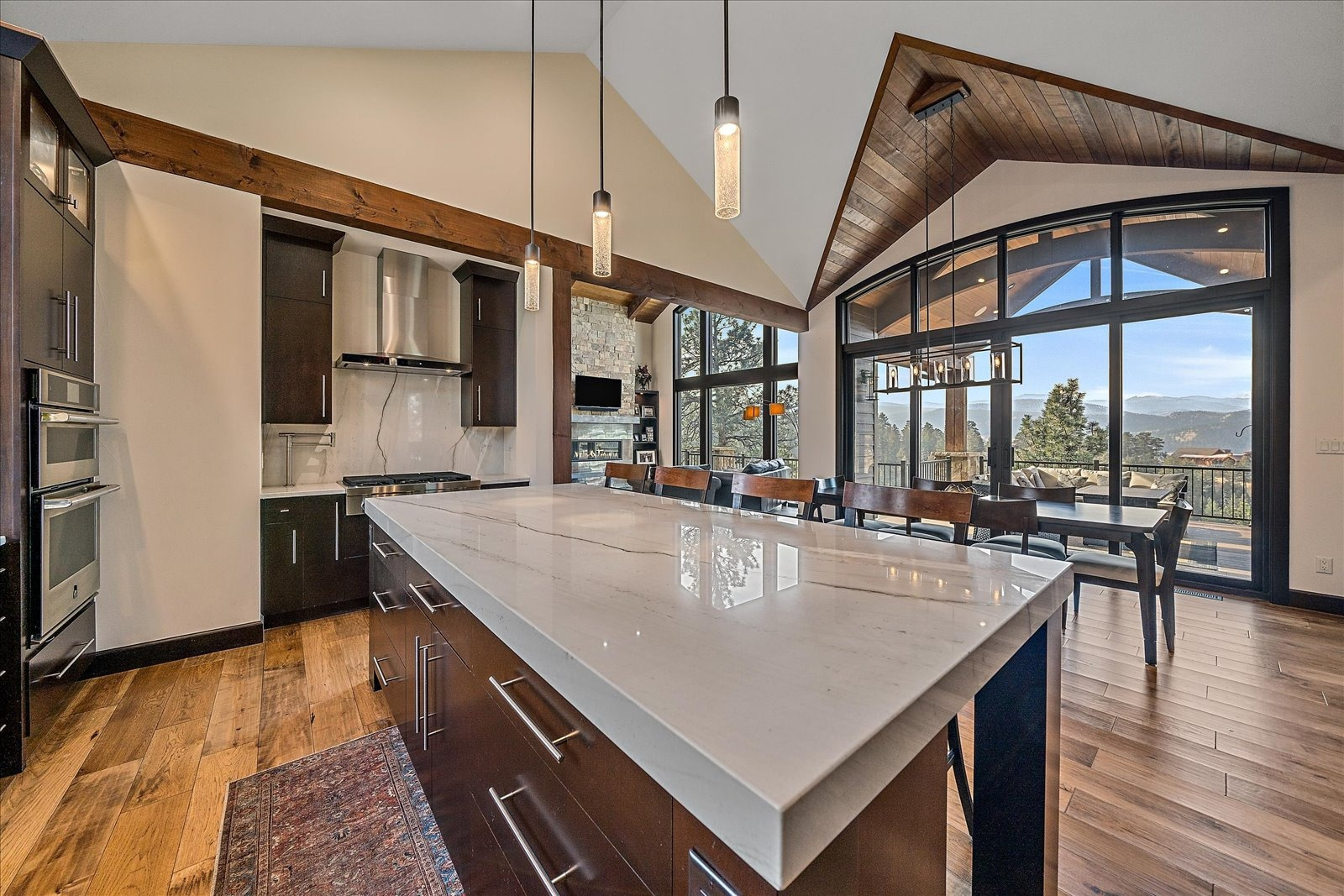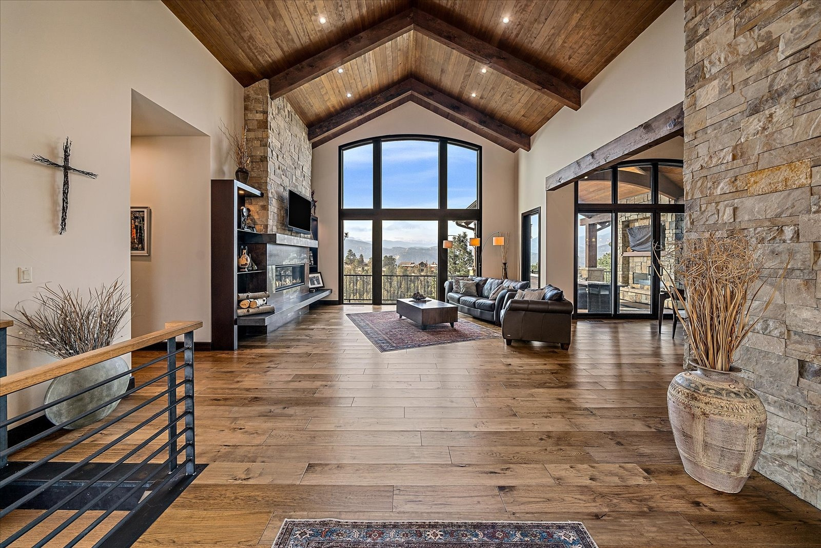 This is the ultimate estate with a blend of convenience, privacy & perhaps the best snow-capped views in Evergreen. This custom home offers luxurious, yet comfortable, mountain living with stunning architectural touches. There is a harmonious blend of rustic and modern finishes. As you enter the foyer, Mt. Blue Sky is optimally framed in the windows beyond. The great room offers a large entertaining area with a warm wood-paneled ceiling & over-sized fireplace. This area flows seamlessly into the dining area that has been designed for gatherings large or small & open to the gourmet kitchen w/ the epicurean in mind. From the gas range to enormous pantry and island, you will love cooking and engaging with family. Thoughtfully constructed with aging in place in mind, the home offers true main level living. A sumptuous primary suite captures the expansive views and a fireplace while the bath is magazine-worthy. Enjoy the huge closet that conveniently connects to the stunning laundry room. The main level office might be difficult to work in given the snow-capped vistas, but it is worth a try. The lower level is the ideal space for entertainment. A game room/family room welcomes you where the pub-like bar will become the hub of the space island & brick surround. A media room makes the perfect space for movie watching & there are two generously-sized bedroom (one has its own en-suite bath). The home gym means less trips leaving your private oasis. A huge bonus is the 2300 sqft unfinished space w/separate garage door. This is a blank slate for your storage, living expansion, hobbies. The attached 3 car garage is heated, and offers a shower and entrance into a mud room that was designed with 4-legged friends in mind. As astonishing as the interior is, the exterior is awesome w/ upper level deck offering an outdoor living room w/ gas fireplace, TV space and multiple seating areas. The lower patio has a private hot tub. Enjoy a real yard, & gentle driveway.